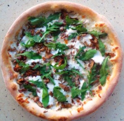 Sos śmietanowy, mozzarella, kurki z lasu, serek kozi, kawałeczki boczku i rukola to nasz przepis na sierpniową Pizzę Miesiąca.