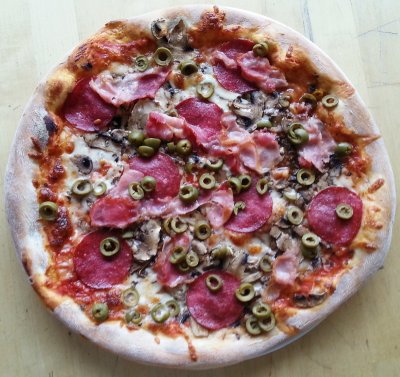 Sos pomidorowy, mozzarella, pieczarki, salami, boczek dymem wędzony, oliwki i oregano.